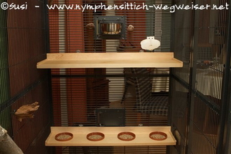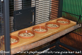 Zusätzlich wurde über die gesamte Volierenbreite ein Sitzast mit Kabelbindern angebracht. Hier sieht man die alte Futterbar auf der gegenüber liegenden Seite der Voliere. Sie hat 6 Futterschalen. Bei einer Breite von ca. 80 cm ist es den Vögeln jedoch zu eng. Es werden maximal vier gleichzeitig genutzt.