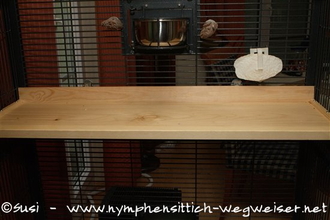 Als Schutz vor Kot dient ein weiteres Holzbrett über der Bar. Es wurde in gleicher Weise gebaut, jedoch ohne Löcher. Auf diesem Kotschutz lässt sich auch Frischkost platzieren, sofern darüber kein Sitzplatz ist. Steht Frisches höher als das Körnerfutter, wird es womöglich auch eher beachtet.