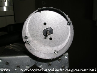 Als Halterung dienen Stuhlwinkel, die an der Unterseite des Bretts mit Holzschrauben befestigt werden. Mit Schrauben, Unterlegscheiben und Flügelmuttern ist eine Befestigung am Volierengitter einfach möglich. Alle Schrauben und Halter sollten aus Edelstahl sein.
