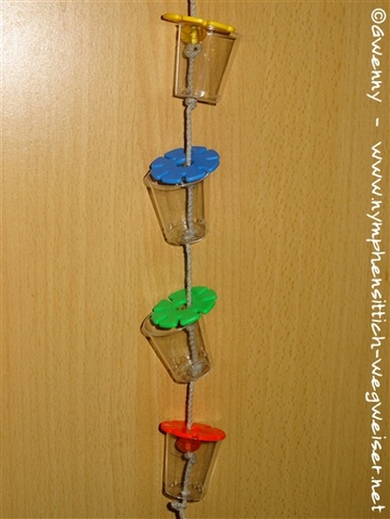 Das Seil wird auf die benötigte Länge abgeschnitten. Dann macht man den ersten Doppelknoten und fädelt es unten durch den Becher. Oberhalb des Becherrandes macht man einen weiteren Knoten. Auf diesem Knoten sitzt dann die Perle auf, die den Deckel (hier Steckblume) etwas weiter oben halten wird, damit die Nymphensittiche den Deckel etwas besser wegschieben bzw. hochheben können. Zudem erhält die Girlande dadurch etwas mehr Stabilität.
