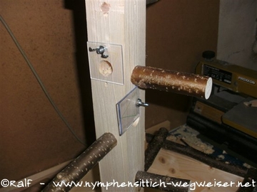 In ein Vierkantholz werden nun verschiedene Verstecke eingebaut und darunter jeweils ein Sitzplatz vorgesehen, so dass die Nymphensittiche dann an das Türchen ran kommen. Die Verstecke werden mit dem Forstnerbohrer oder notfalls auch mit einem sehr dicken normalen Bohrer in das Vierkantholz gebohrt.