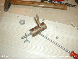 In das obere Loch wird nun eine Stockschraube gedreht, so dass man die Halterung mit einer Flügelmutter und Scheiben an der Voliere befestigen kann.
