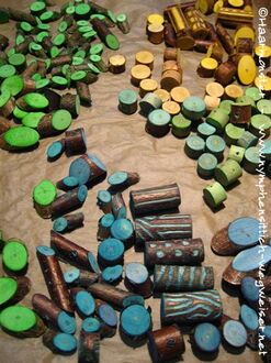 Färben kann man eigentlich fast alles, was aus Holz oder ähnlichen Stoffen ist. Nur sollte man daran denken, dass künstliche Farbstoffe (Lebensmittelfarbe) eingesetzt werden und man keine genaue Wirkung auf Vögel kennt. Deshalb ist es empfehlenswert nur wenige Farbtupfer im Spielzeug unterzubringen, da sie sicher ausreichend sind, um den Tieren in optischer Hinsicht Abwechslung zu bieten. Hier ein paar Eindrücke einiger frisch gefärbter Perlen.