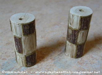 Hier nimmt man den ganzen Ast, bohrt das Loch entsprechend und sägt erst dann. Nachfolgend wieder bohren, sägen... Würde man es hier in umgekehrter Reihenfolge machen, hätte man bald den Bohrer im Finger und müsste jede Perle einzeln einspannen.
