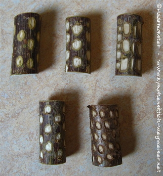 Um Perlen aus Holz herzustellen, benötigt man getrocknete Äste verschiedener Stärke. Würde man frisch geschnittenes Material verwenden, kann es zu Schimmelbildung kommen und das Holz kann beim Trocknen reißen.