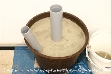 Schritt 3: Das Abflussrohr mit dem größeren Durchmesser mittig setzen und mit großen Steinen fixieren. Das Abflussrohr mit dem kleineren Durchmesser wird an den Rand gesetzt. Die erste Menge Beton wird eingefüllt.