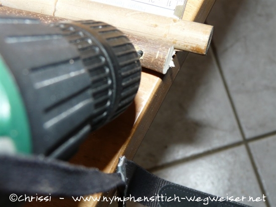 Mit einem 10 mm Bohrer wird in die Äste im Abstand von 10 cm je ein Loch gebohrt.