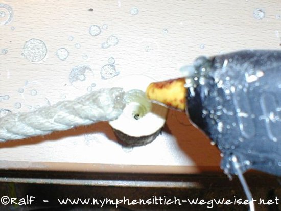 Schritt 2: Etwas Heißkleber hinein (die Vögel kommen nie an diese Stelle heran) und dann das Seil einführen und den Kleber kalt werden lassen.