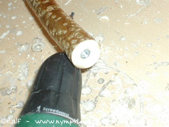 Das Loch für die Stockschraube wird zunächst mit einem kleinen Bohrer vorgebohrt und dann das größere für die Verbindungsmutter. Die Länge der Mutter kann man am Bohrer abkleben, wenn dieser keine Vorrichtung dafür hat. So bohrt man nicht zu tief in den Ast.