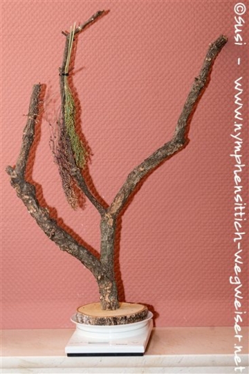 Unsere Wiegehilfe ist fast fertig. Am Ast wird nur noch Hirse oder ein anderes Leckerchen befestigt, um die Vögel damit anzulocken und schon wird der kleine Baum belagert. Nun ist alles fertig, um die Wiegehilfe auf die Waage zu stellen.