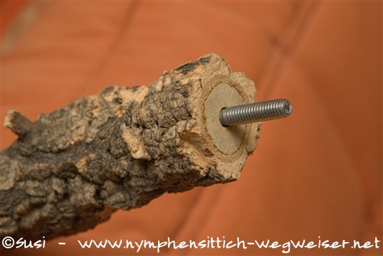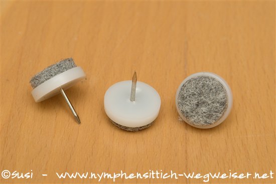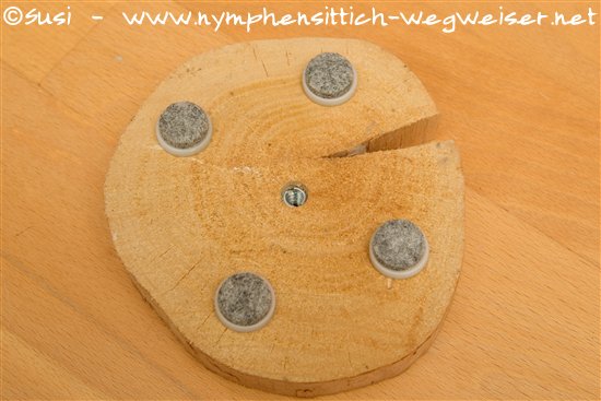 Sollte die Stockschraube etwas zu lang für die Holzscheibe sein und unten heraus stehen, kann man einfach Möbelgleiter von unten in die Scheibe schlagen.