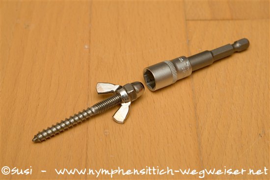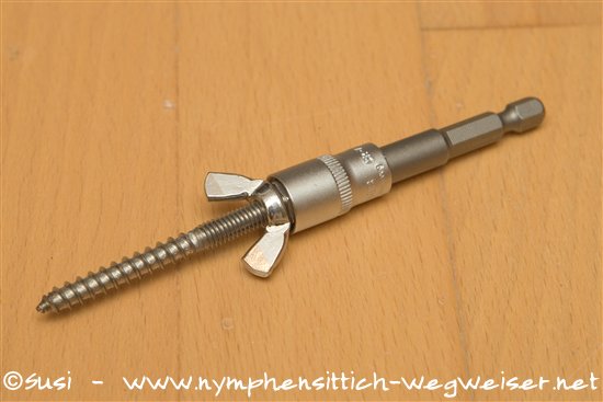 Das Eindrehen der Schraube geht am leichtesten mit Hilfe einer Hutmutter die auf das Ende der Stockschraube geschraubt wird. Damit man diese später wieder problemlos entfernen kann, wird zuvor eine Flügelmutter als Kontermutter eingedreht. Die Hutmutter kann sich so nicht zu stark festdrehen. Sollte die Hutmutter dennoch schwer zu lösen sein, kann man mit der Zange gut an den Flügeln ansetzen und die Hutmutter wieder lösen.