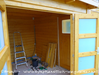 Da wir für die Außenvoliere keine Schleuse einbauen wollten (dies kostet nur Raum für die Vögel) bauten wir vom Schutzhaus aus eine zusätzliche Tür ein, um so das Haus gleichzeitig als Schleuse benutzen zu können.