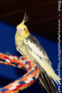 Hallo, mein Kosename ist Bubi-chen und ich war schon so zwischen 16 – 18 Jahre alt, als ich im November 2007 zu Peppie gekommen bin. Ich habe bei meinem früheren Frauchen mit einem Wellensittich zusammengelebt und wir haben uns gut verstanden. Als mein Welli-Begleiter dann gestorben ist, war ich ganz alleine und mein Frauchen hat sich nach einer neuen Bleibe für mich umgesehen. Ich habe ein Problem mit meinem Schnabel, denn der wächst ganz dolle und jetzt fahre ich immer zusammen mit dem Sunday zum Onkel Doktor zur Schnabiküre, wie Peppie das immer nennt. Ich fliege auch mit Nico und Sunday durch die Gegend, aber ich bin kein routinierter Flieger und bin ganz froh, wenn ich dann schon mal mit dem Stöckchen-Taxi wieder nach Hause gebracht werde.