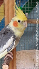 Hallo, mein Name ist Charles und ich bin am 12. August 2024 in die SundayCity-Crew eingezogen. Ich bin ca. 12 Jahre alt, eine Handaufzucht und flugunfähig. Meine ehemalige Federlose, die mich seinerzeit schon liebevoll übernommen hat, hat sich rührend um mich gekümmert, aber ich habe den Kontakt zu Artgenossen schlichtweg verweigert. Ich selbst meine ja, dass ich bei Menschen besser aufgehoben bin. Deshalb bin ich auch gleich der Peppie auf die Schulter gehüpft. Ich wurde dann aber sanft auf die Anflugklappe der Sunday-City-Voliere bugsiert und da habe ich mich erst mal ausgiebig geputzt.