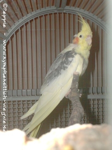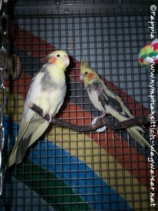 Ein paar Tage musste ich noch in der Kranken-Voliere wohnen und dann durfte ich zu den anderen Nymphies ... das war so aufregend. Meine Schmerzen haben nachgelassen und ich habe dann die Ronja gesehen, der ich mich gleich genähert habe. Aber ich musste am Ball bleiben, denn Ronja ist ein sehr schüchternes, zurückhaltendes Mädel. Aber sie hat meine Zuneigung erwidert und wir wurden inflagranti beim Köpfchen kraulen erwischt.