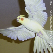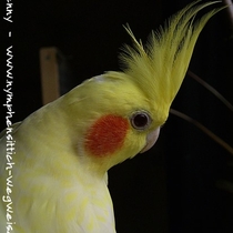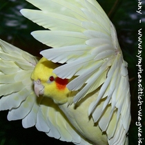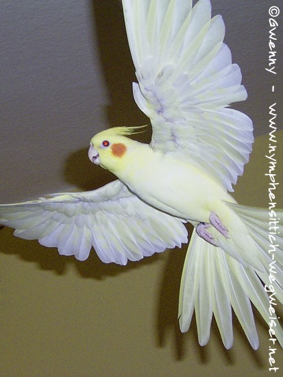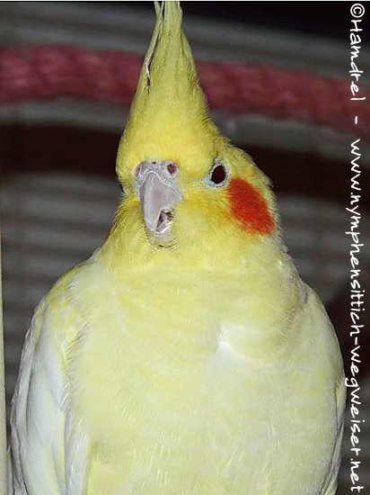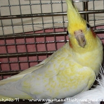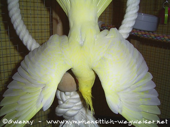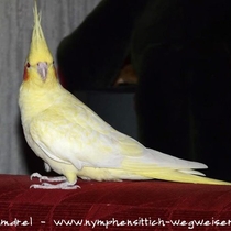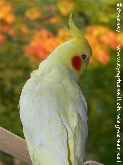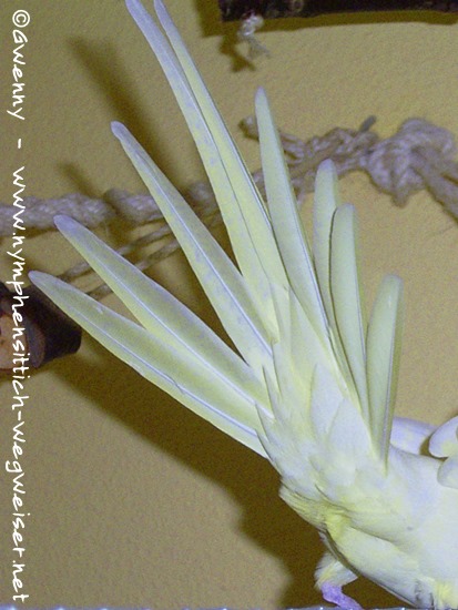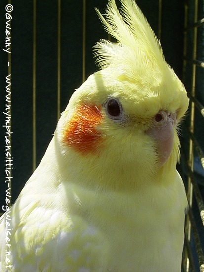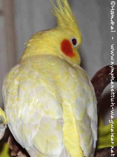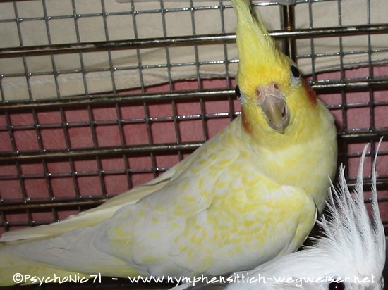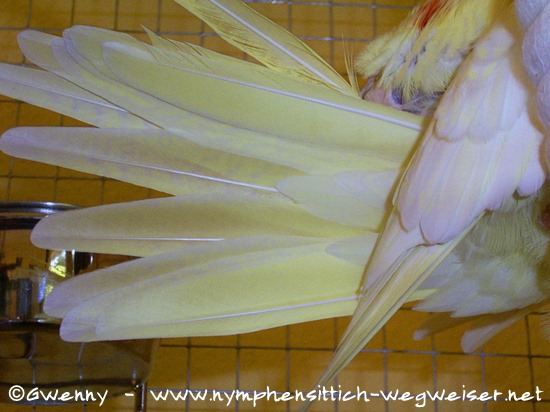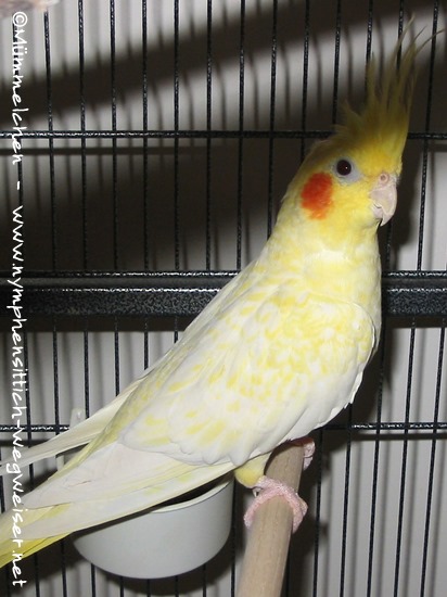 Bei weniger hohem Gelbanteil kann ein geperlter Lutino leicht mit einem normalen Lutino verwechselt werden.