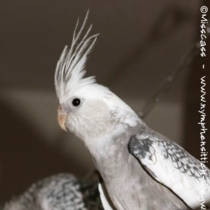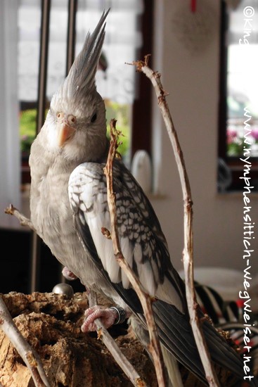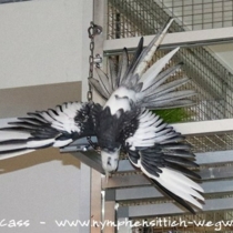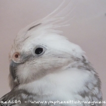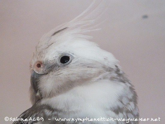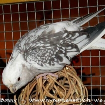 Durch das Kreuzen von wildfarbenen Opalinen und wildfarbenen Schecken mit den ersten wildfarbenen Weißkopf Nymphensittichen, kam es zur Mutation der opalin-gescheckten Weißköpfe. Diese Schecken tragen, neben der weißen Farbe mit Scheckungen, geperlte bzw. gesäumte Federn unterschiedlicher Intensität.