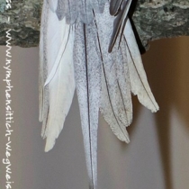 Auch hier sehen die Jungvögel beider Geschlechter und adulte Hennen gleich aus. Das Prinzip der Geschlechtsbestimmung ist wie beim wildfarbenen Opalin-Schecken. Die jungen Hähne verlieren ihre Zeichnung in der Jungmauser und oft erinnern nur noch verwaschene Flecken an die ehemals vorhandene Perlenzeichnung. Sie sind nach dem Ausfärben optisch kaum noch von normalen Schecken zu unterscheiden. Im Gegensatz zu normal opalin-wildfarbenen Weißköpfen, verlieren bei der gescheckten Mutation die Hähne die Perlungen allerdings deutlich langsamer, so dass sie oft erst mit 2 - 3 Jahren komplett umgefärbt sind.