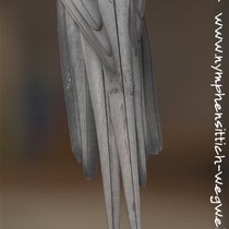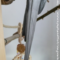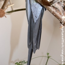 Die Schwanzfedern sind oberhalb silbergrau und unterhalb schieferfarben bis schwarz.