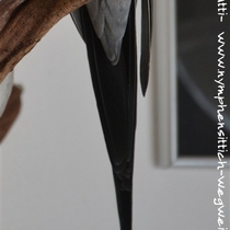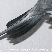 Die Schwanzfedern sind ebenfalls oberhalb grau und unterhalb schieferfarben bis schwarz. Auch hier kann es vereinzelt zu aufgehellten, ganz gelben oder marmorierten Federn kommen.