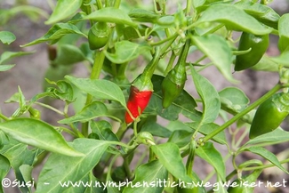Wenn man das hintere Ende der Chilischote abschneidet, kommen viele kleine Samen zum Vorschein, die gerne gefressen werden.