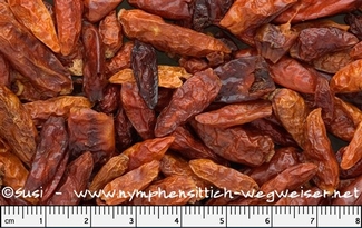Chilischoten können getrocknet oder frisch verfüttert werden. Gerne werden Chilischoten als Leckerchen aus der Hand gefuttert. Auch unter das Kochfutter gemischt wird Chili gerne gefressen.