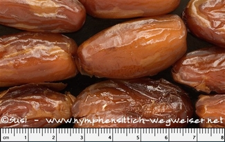 Die Dattelfrucht ist meist eiförmig bis länglich und enthält in ihrem Inneren viele kleine Samen.