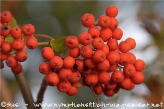 Die Früchte und Blätter der Eberesche werden gerne von Nymphensittichen und anderen Vögeln gefressen. Die Eberesche gehört zur Gattung der Mehlbeere und deren Früchte sehen wie kleine Äpfel aus. Ebereschenbeeren enthalten viel Vitamin C, Provitamin A, sowie Sorbit, der ein Zuckeraustauschstoff ist.