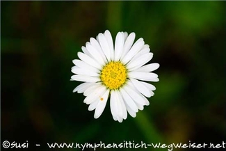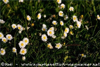 Gänseblümchen sind für die Einmischung ins Futter etwas groß. Für eine Zusatzfütterung in einer Wühlkiste oder in einer Schale auf dem Boden sind sie gut zu verwenden.