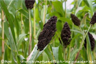 Mohrenhirse ist eine Sorghum-Hirse und als einzelne Saat im Handel bisher nicht erhältlich. Als Kolben sind uns in Deutschland bisher lediglich zwei Bezugsquellen bekannt. Dari oder Mohrenhirse gehört zur Gattung Sorghum aus der Familie der Süßgräser. Dieses einjährige Rispengras erreicht eine Wuchshöhe von 2,50 bis 5,00 Meter.