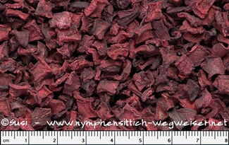 Getrocknete Rote-Bete-Würfel sind ein besonderes Leckerchen, das in einem separatem Napf angeboten oder in größeren Stückchen aus der Hand verfüttert werden kann. Zum Untermischen unter das Kochfutter sind diese Würfel ebenso gut geeignet.