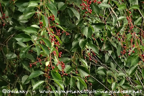 Der traubige Fruchtstand erscheint im Juli und August und zeigt unreif erst rote, später schwarzblau glänzende, kleine Kirschen. Diese Früchte werden bis zu 8 mm groß und schmecken sehr herb.