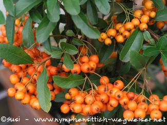 Verfüttert werden die Blüten und reifen Beeren des Feuerdorns. Sie werden am gesamten Ast angeboten. Die Dornen an den Ästen müssen dazu nicht zwingend entfernt werden. Wem damit wohler ist, kann die Blüten und Beeren natürlich auch abpflücken und den Vögeln reichen. Der Feuerdorn ist bei Nymphensittichen sehr beliebt und die im Inneren der Beeren enthaltenen Kerne werden als erstes geknackt.