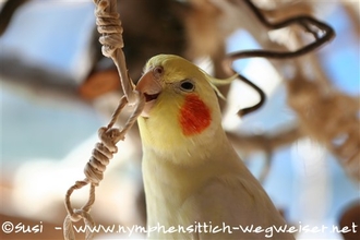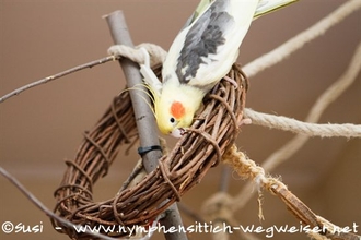 Unsere Nymphensittiche benötigen viel Abwechslung, Knabber- und Klettermöglichkeiten. In Zoogeschäften und im Online-Versand gibt es viele schöne Spielsachen zu kaufen. Unsere Nymphensittiche begnügen sich auch gern mit einfachen und selbstgebastelten Spiel- und Klettermöglichkeiten.