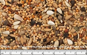 Diese Mischung besteht aus 13 Saaten und ist trotz fehlender Sonnenblumenkerne recht gehaltvoll, sofern die eigenen Nymphensittiche Kardi fressen. Diese Saat wird allerdings von vielen Nympensittichen nicht gut angenommen. In diesem Fall muss die Mischung auch nicht weiter gestreckt werden.