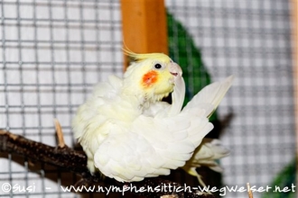 Nach der Entgiftung ging es langsam aufwärts mit meinem Befinden. Ich kann zwar immer noch nicht fliegen, aber ich hänge total gerne am Gitter und mache „Engelchen". Auch klettern kann ich inzwischen viel besser und das mache ich super gerne. Peppie hat ja alles so eingerichtet, dass man auch als Nicht-Flieger überall hinkommt. Trotzdem liebe ich es nach wie vor einfach auf einem Korkbrettchen am Gitter zu sitzen.