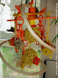Bitte Vorsicht mit Bast! Manche Nymphensittiche beginnen daran zu spielen und zu knabbern und es entstehen gefährliche Schlaufen, in denen sie sich mit der Füßchen verfangen können. Bast bitte nur unter Aufsicht anbieten und darauf achten, dass keine Schlaufen entstehen.