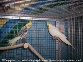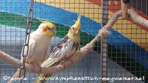 Hallo, ich heiße Rocky und bin schätzungsweise schon volljährig (18). Vor über 10 Jahren wurde ich von einem Federlosen aus schlechter Haltung befreit. Dieser Federlose ist aber inzwischen gestorben und zum Schluß konnte er sich auch nicht mehr um mich und meinen Partner kümmern und bei Renovierungsarbeiten ist mein Partner dann in einen Farbeimer gefallen und gestorben. Nachdem der Federlose gestorben ist, kamen ich und ein anderer Nymphie zu seiner Nichte; aber dort gab es Katzen und wir hatten Angst. Ich rupfe mich an den Flügeln und kann deshalb auch nicht fliegen. Dann hat uns die Lisa (callopsite) mitgenommen und dort kamen wir zu vielen anderen Nymphies. Leider kam ich dort nicht wirklich zurecht, da ich ja nicht fliegen kann und war so immer irgendwie ausgegrenzt. Am Sonntag, den 10. März 2013 wurde ich dann eingepackt und wir fuhren nach Bonn. Dort gab es andere Federlose und da war dann auch die Peppie, die mich dann später mitgenommen hat. Aber die ganzen Federlosen tranken erst mal Kaffe und aßen Kuchen und ich stand mit meinen Käfig nebem dem Tisch und plötzlich bekam ich auch Hunger und habe Hirse gemampft. Auf der Fahrt nach Düsseldorf durfte ich dann bei dem federlosen Ulrich auf dem Schoß sitzen, der immer beruhigend auf mich eingeredet hat. Nachdem wir angekommen waren, wurde meine Box vor eine Voliere gehalten und ich bin gleich rausgeklettert und habe mir ein Plätzchen gesucht. Ich erzähle Euch dann noch, wie es weitergegangen ist.