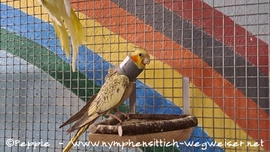 Ich habe Sasu recht schnell wieder abgeholt - sie ein paar Tage stationär untergebracht - da sie beim Doc nicht futtern wollte und mit Brei gefüttert werden musste. Sasu saß dann erst mal alleine, da sie 2 x täglich Medizin bekommen musste und ich so auch besser kontrollieren konnte, ob sie auch wirklich futtert. Nach der Behandlung habe ich sie dann in den Handicap-Schwarm überführt und schon gleich am zweiten Tag ließ sie sich problemlos nach dem Freiflug in die große Sunday-City-Voliere dirigieren.