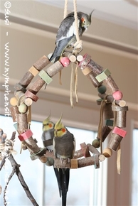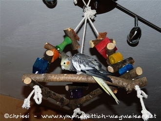 Schaukeln gibt es in den vielfältigsten Varianten. Die einfachsten haben eine Holzstange und Drahtbügel, aber es gibt auch welche mit Mangrovenholzstücken, bunten Klötzchen und Kugeln. Baumwollringe sind auch sehr beliebt, doch sollte man immer ein Auge darauf haben, ob einer der Nymphensittiche die Fäden frisst. Diese sammeln sich womöglich im Kropf und müssen dann irgendwann operativ entfernt werden.