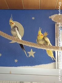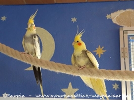Beim ersten Freigang haben sie die Villa Sunrise verlassen und sind bis jetzt immer in der Sunday-City-Voliere. Noch üben wir ein bisschen das Reinsetzen, wobei Timmi ganz artig das Stöckchentaxi annimmt.