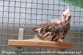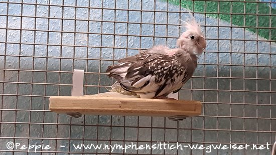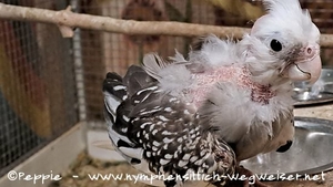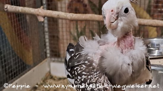 Sie ist in der Klinik ein bisschen gepäppelt worden und bekam dort erst mal hochdosierte Schmerzmittel. Zusätzlich sind die Handschwingen am rechten Flügel gekürzt worden. Dies ist ein Versuch, denn mit dem Flügel kann sich Bijou nicht mehr umdrehen, wenn sie mal runterpurzelt. Mal sehen, wie die Medizin anschlägt und wie es weitergehen wird.