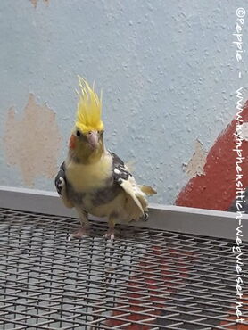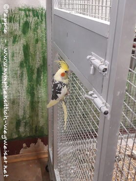 Am Gitter hängt er, weil er zu den anderen zurück wollte. Ich hatte die Klappe jedoch geschlossen, damit erst mal kein anderer ausbüxen kann.