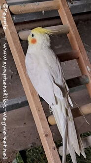 Hier ist der kleine Maxi; letztens hat er sich doch glatt das erste mal auf die Leiter getraut, mit der man wieder zurück in die Sunday-City-Voliere klettern kann.