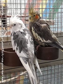 Und hier sitzt Pacy mit seiner Freundin Pünktchen am Futternapf; wohl wissend, dass sich gleich die Türen und Klappen zum Freiflug öffnen werden.