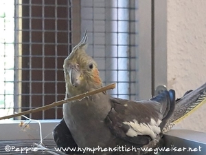 Hier sitzt Thira ganz entspannt auf der Villa Sunrise. Inzwischen darf man sie fast mit dem Stöckchen-Taxi berühren, welches wir immer zum Dirigieren benutzen. Vom Dach der Villa aus fliegt Thira dann immer durch die Seitenklappe zurück in die Sunday-City-Voliere.